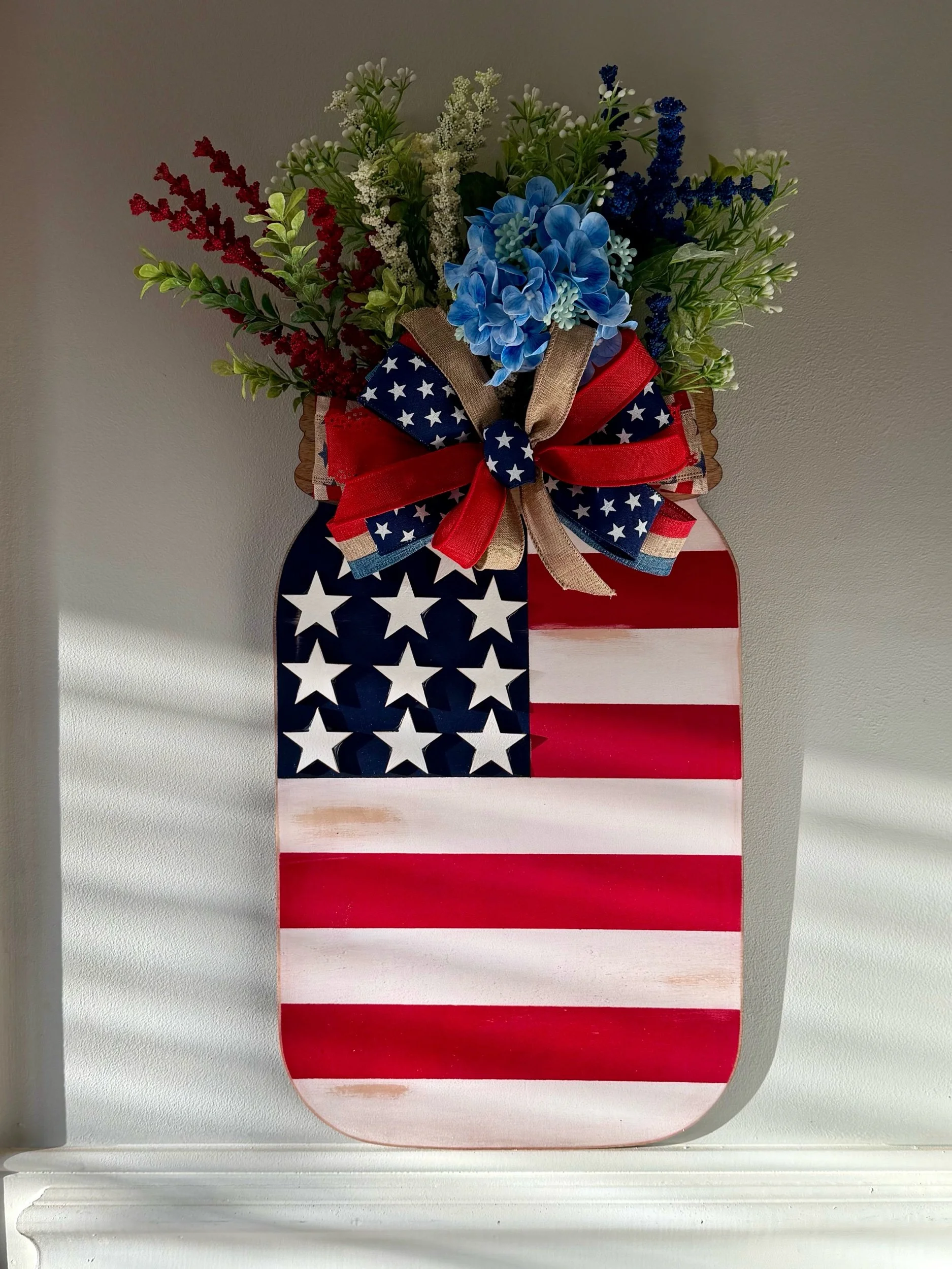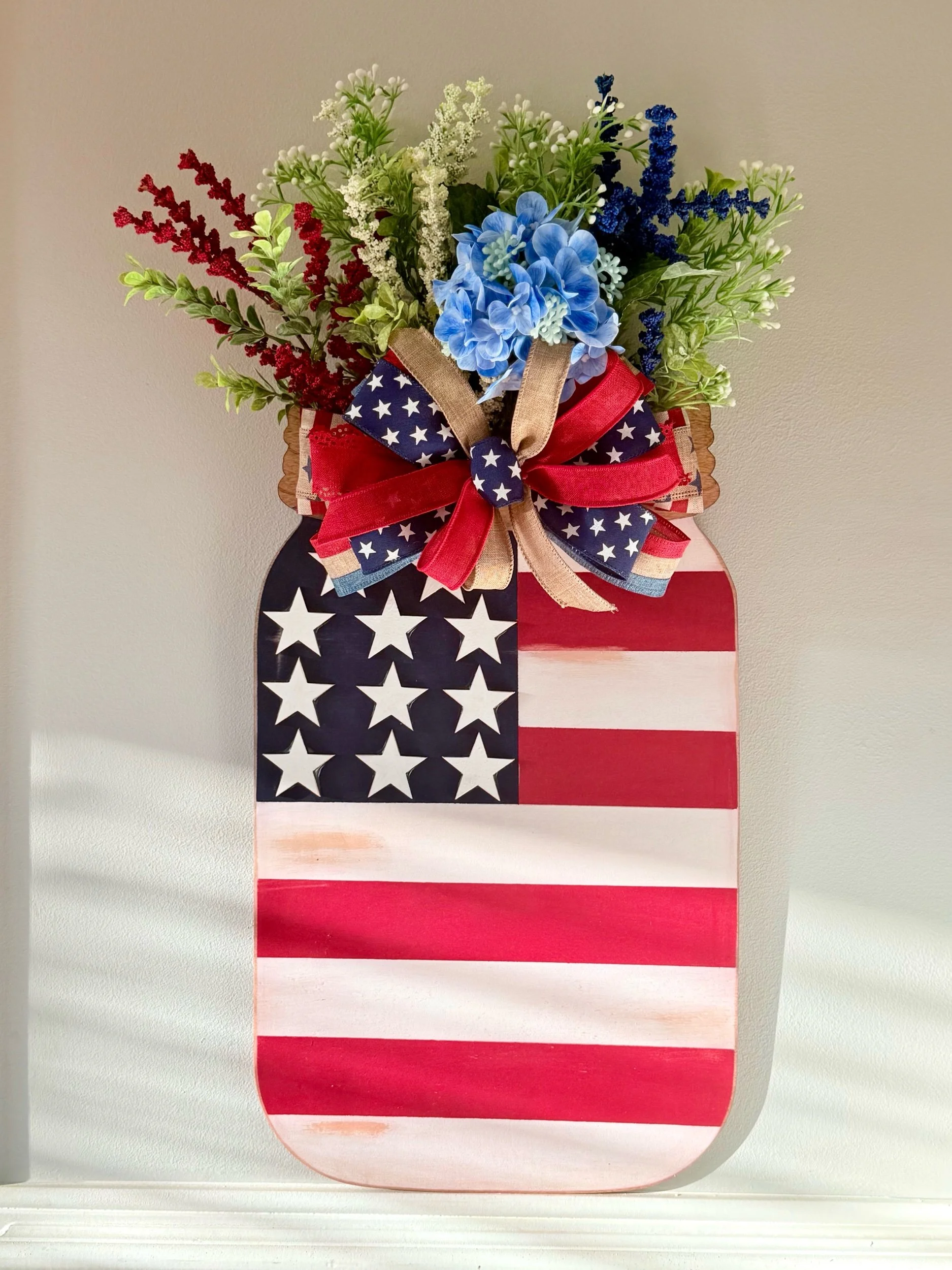 Door hanger is 24” tall x15 wide” from the top of flowers to bottom of mason jar- same with width. Made from Birch plywood includes Ribbon/Twine for hanging
